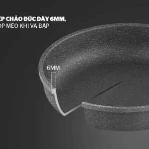 - Siêu bền: Chảo SBD28 được làm từ hợp kim nhôm cao cấp dày 3.0mm, sử dụng công nghệ đúc Hàn Quốc giúp sản phẩm đạt tới sự bền chắc tuyệt đối. Miệng chảo dày dặn (6.0mm) hạn chế tối đa tình trạng móp mép khi bị va chạm. Lớp vân đá hoa cương giúp tăng khả năng chống dính, hạn chế bong tróc cũng như ngăn bám bẩn, dễ dàng vệ sinh, giữ sản phẩm luôn như mới.