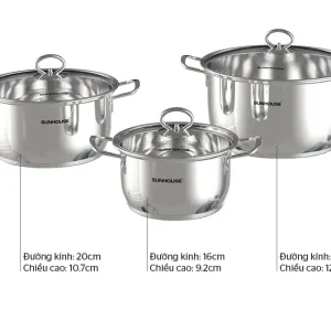 Bộ nồi inox 5 đáy SUNHOUSE SHG788 sử dụng được với mọi loại bếp, kể cả bếp từ. Bộ sản phẩm gồm 3 nồi với đường kính 16cm – 20cm – 24cm phù hợp với nhu cầu nấu nướng của mọi gia đình. Nồi nhỏ 16cm thích hợp để luộc trứng, kho thịt, nồi cỡ trung 20cm để nấu canh cho 2-4 người và nồi lớn 24cm có thể luộc gà, nấu canh hoặc lẩu cho 3-5 người.