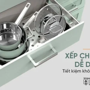 Với thiết kế kích thước thông minh, các sản phẩm trong Bộ nồi chảo có thể xếp chồng lên nhau một cách dễ dàng, giúp tiết kiệm không gian bếp kể cả với những căn bếp nhỏ và không có nhiều diện tích.
