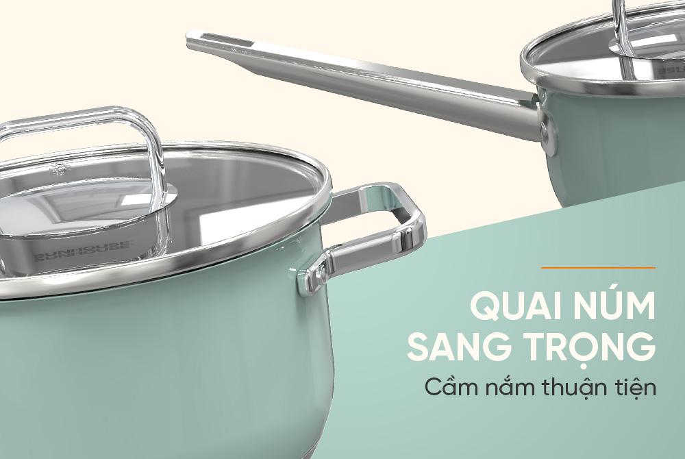 Quai núm của Bộ nồi chảo SUNHOUSE SHG608 cũng được thiết kế bằng chất liệu Inox chắc chắn, cứng cáp, giúp bạn dễ dàng cầm nắm và di chuyển trong quá trình sử dụng.