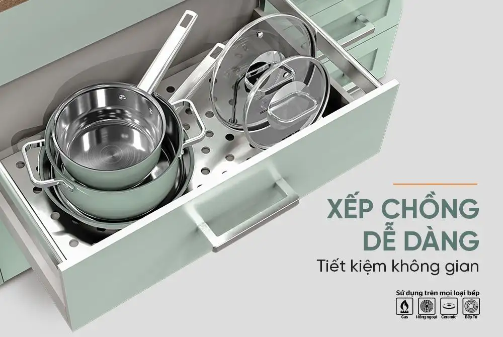 Với thiết kế kích thước thông minh, các sản phẩm trong Bộ nồi chảo có thể xếp chồng lên nhau một cách dễ dàng, giúp tiết kiệm không gian bếp kể cả với những căn bếp nhỏ và không có nhiều diện tích.