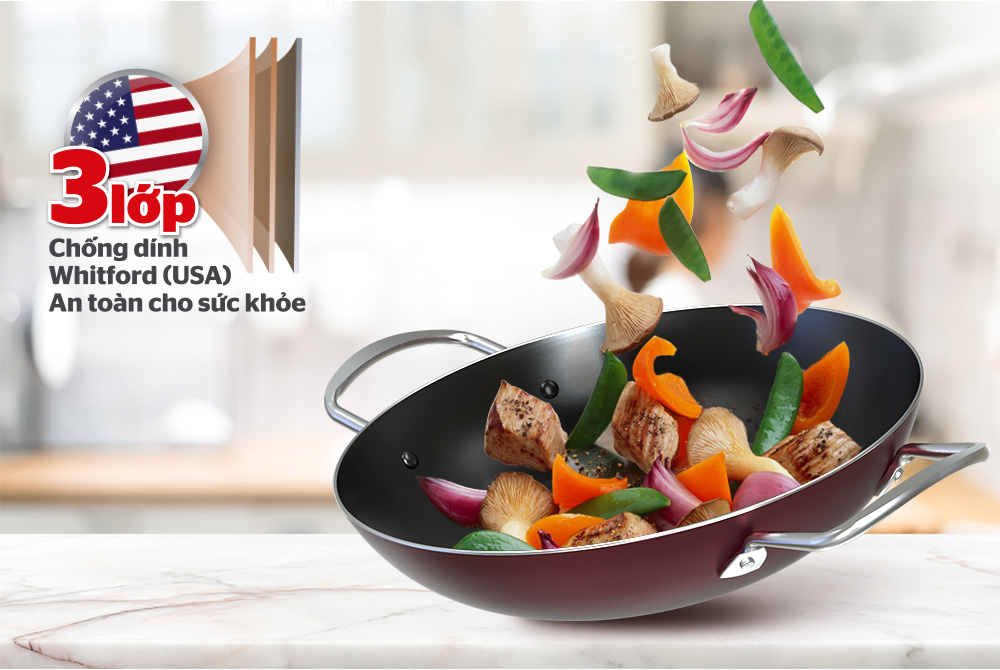 Chảo phủ 3 lớp chống dính Whitford (USA) tuyệt đối không có tình trạng thôi nhiễm vào thức ăn, an toàn cho sức khỏe. Bề mặt chống dính siêu bền, tuổi thọ dài, dễ dàng vệ sinh và tẩy rửa. Chảo còn giúp giữ được hương vị tươi ngon của thức ăn trong thời gian tương đối.