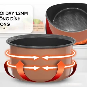 Lòng nồi làm từ hợp kim nhôm dày tới 1.2mm giúp giữ nhiệt tốt, cơm ngon lâu hơn và hương vị được giữ trọn vẹn. Đặc biệt lớp phủ chống dính vân tổ ong cao cấp với độ bền cứng cao giúp sản phẩm bền bỉ, hạn chế móp méo trong trường hợp va đập.