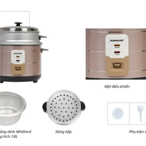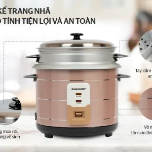 Nồi cơm điện 1.8L SUNHOUSE SHD8125 có vung rời thuận tiện, dễ dàng mở ra đóng vào trong quá trình sử dụng. Nắp vung bằng inox sáng bóng, thân nồi bằng tôn sơn cách điện màu vàng đồng, phủ nhũ chống gỉ giúp nồi luôn sáng bóng như mới.